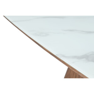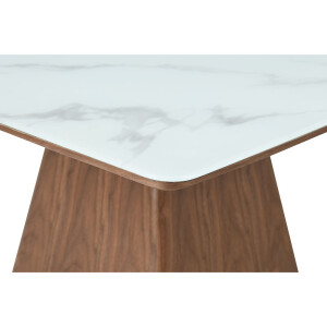 Το τραπέζι TOTEM συνδυάζει την κλασική ζεστασιά του ξύλου με την εκλεπτυσμένη υφή του γυαλιού με όψη μαρμάρου. Η τετράγωνη του επιφάνεια με διάσταση 120 cm είναι από γυαλί με φινίρισμα που παραπέμπει σε λευκό μάρμαρο, ενώ η κωνική βάση σε απόχρωση καρυδί από veneer δρυός προσφέρει σταθερότητα και αισθητικό ενδιαφέρον. Το τραπέζι αυτό αποτελεί μια statement επιλογή για κάθε μοντέρνο καθιστικό ή τραπεζαρία.